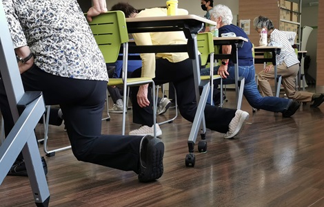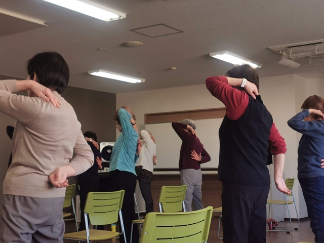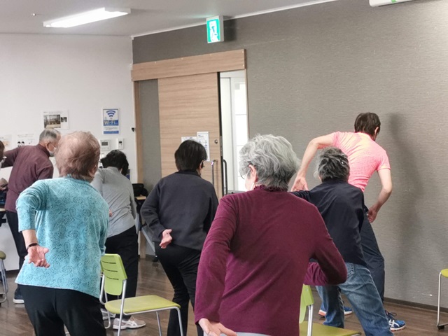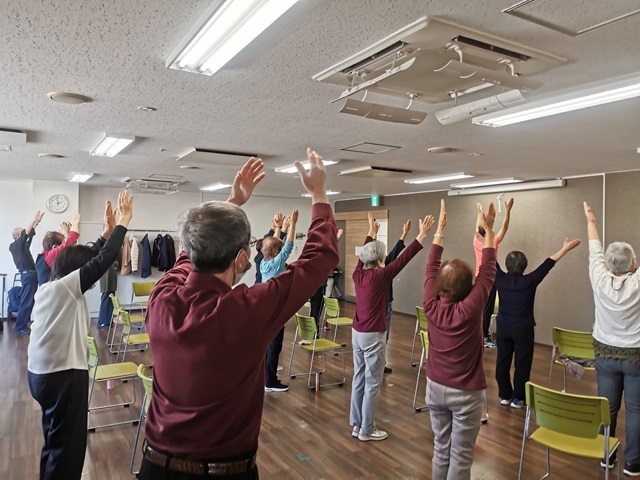 会の発足当時から開催されているこの教室では、座位と立位、両方で体幹を鍛えていき途中、音楽に合わせながら、軽く汗ばむ程度まで体を動かしていきます。以前は、ジムに通っていたけれど体力の衰えで少しペースを落としたい方、あるいは週一回程度、体を適宜動かしてみたい方、散歩だけでは日々の運動に不安な方など、プラスアルファの運動を希望される方々にご好評いただいています。